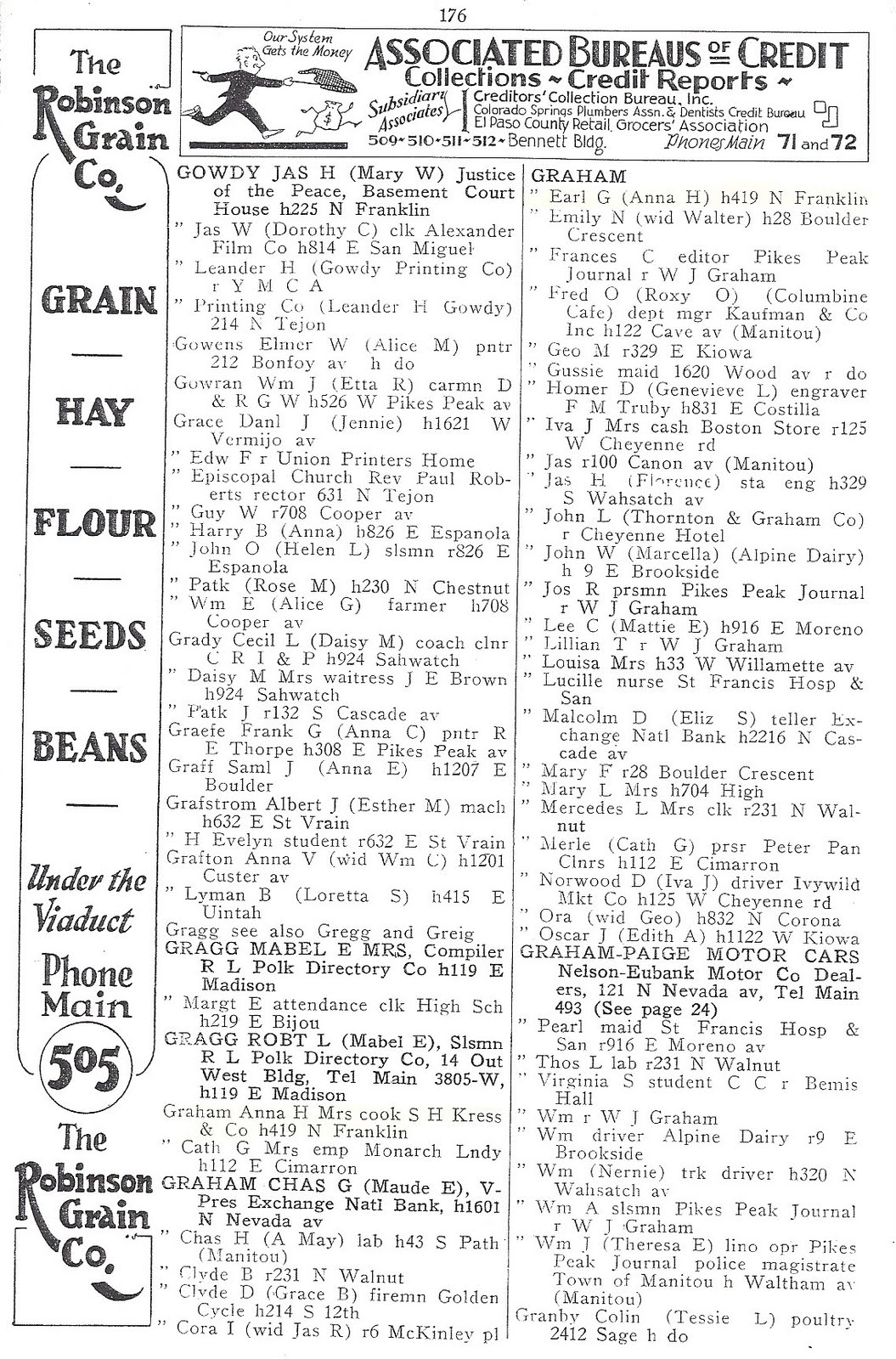 1928 Colorado Springs directory. Ann & Earl Graham moved to Colorado Springs in 1926, after the death of her father, Nathaniel T. Dodge. They lived on 1219 N. Wahsatch Avenue.